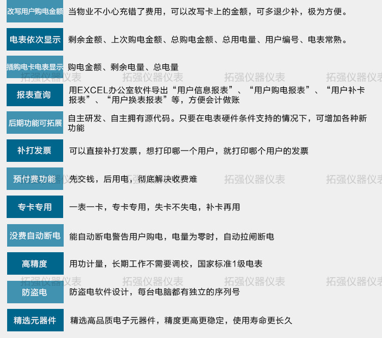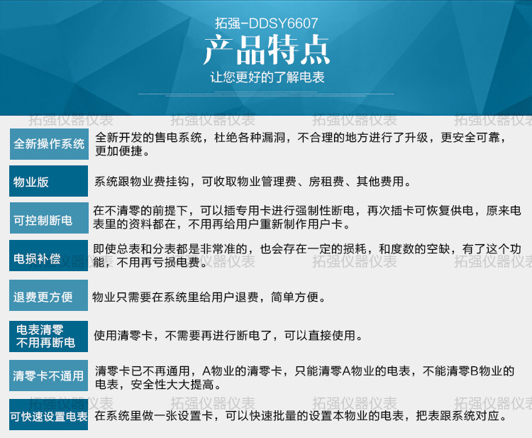 主要特点:应用计算机管理,先购电后用电;在额定电流范围内能限制最大使用功率(由供电部门限定);一表一卡,专卡专用,失卡不失电,补卡再用;电卡能双向传递数据,能自动断电告警用户购电;电量为零时,自动拉闸断电;并具有一定的防窃电软件设计等。