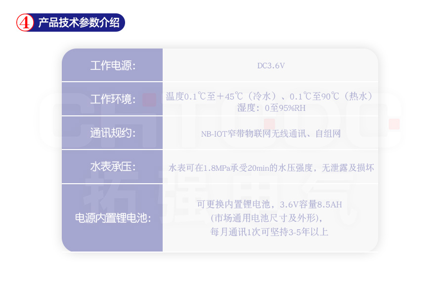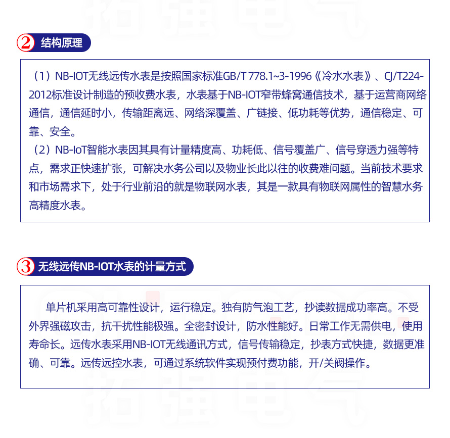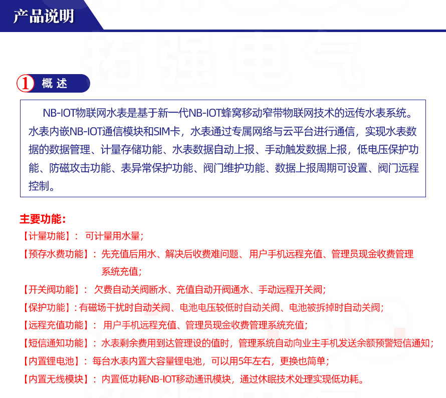 NB-IoT物联网无线远传水表是拓强自主研制的一款用于远程抄表及阀控的智能预付费水表。它通过窄带物联网(Narrow Band Internet of Things, NB-IoT)与服务器进行远程通讯,无需使用采集器或集中器设备,采用一表一流量卡的点到点连接方式,简化了设备安装工作,实现了对水表使用量的自动远程抄表,并有效的避免了管理部门上门抄表的人力工作。该水表具备阀门控制功能,可方便管理部门对水表的用水情况进行控制,使得远程抄表及控制变的便捷、可靠,在节约人力、物力和财力的同时,有效提高了生产效益。