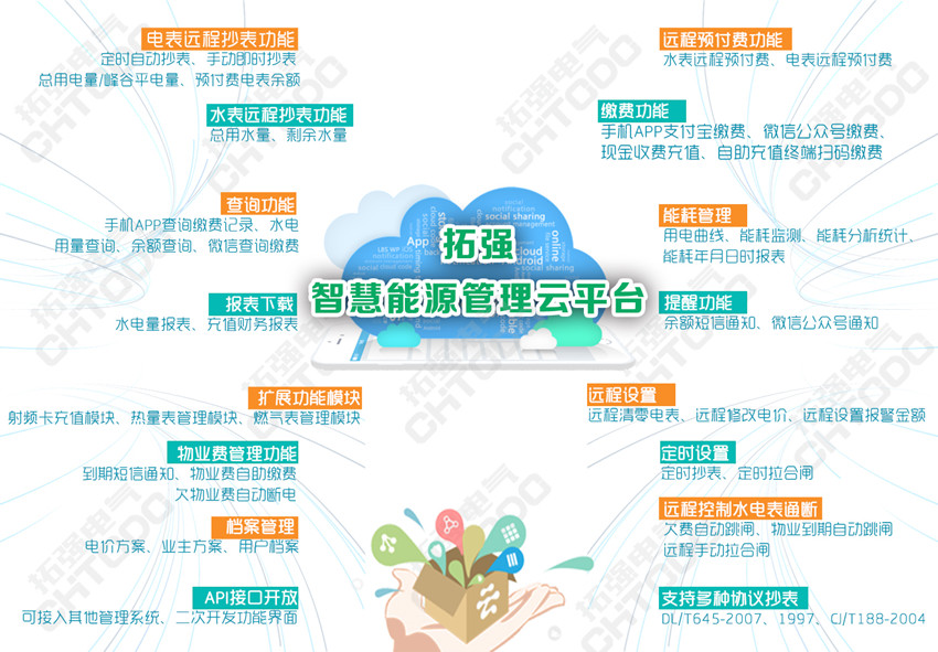 根据市场需求,拓强电气有限公司开了远程抄表系统,预付费电表远程抄表系统不存在工作人下班时间无法进行购电,也不需要繁琐的插卡,轻轻松松的就可以使用微信、支付宝、APP等实现手机缴费。即使不会使用手机支付的部分人,也可以到物业现金缴费,物业在系统后台远程对电表进行充值。